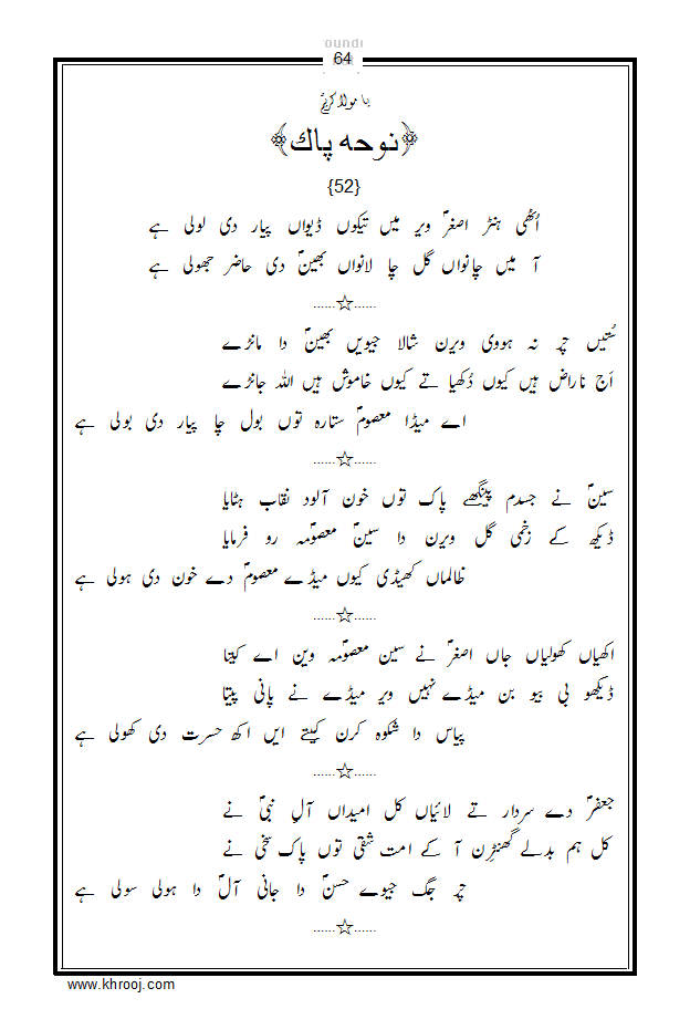 اٹھی ہنڑ اصغر(ص) ویر میں تیکوں ڈیواں پیار دی لولی ہے Audios, Noohy Paak Written Kalam EnglishUrduاو-کوفے-والیو-میڈی-گالھ-بھلاہے-نہAudios, Noohy Paakمیں-ڈیکھ-آئی-ہاں-عباسص-جری-ودے-اوکھے-وقت-نبھیندن-کرو-شام-دی-ہنڑ-تیاریAudios, Noohy Paakاجہ-صبر-دے-نال-نبھا-غازیص-پیاں-وعدہ-ویرص-کرینداAudios, Noohy PaakUTRA KON RUB KAYAudios, Nazam pakخوشیاں-گھن-کے-جگ-اُتے-ہے-آ-گئی-تیرہ-رجبAudios, Nazam pakشام-میں-ونجنڑائے-عورتاں-پچھسن-سونڑ-تیڈے-تھئے-ہن-کیویں-ڈس-بنراص-جواب-میں-کیا-ڈیساںAudios, Noohy Paakسفر دو ویندائے پیو اکبر(ص) دا چھوڑ کے پاک مزاراں کوںAudios, Nazam pakکربلا دو اجہ شبیر(ص) دی تیاری ہےAudios, Noohy Paakتیکوں کربلا عرشِ اعلیٰ بنڑیساںAudios, Noohy Paakلعل حسن(ص) دا تیکوں مہندی لانواں تے بنرا(ص) بنڑانواںAudios, Noohy Paakشاہ قاسم(ص) کوں پرنایا ہے.شبیر(ص) نے سہرہ پایا ہےAudios, Noohy Paakقاسم(ص) وچہ کربل دے تئیں واہ جو سیج سہائی ہےAudios, Noohy Paakرات ڈاہویں دی کربل دیوچہ آخری رات شبیر(ص) دی ہےAudios, Noohy Paakڈیکھ اکبر(ص) تیڈو وچھڑی دا پیام آیا ہےAudios, Noohy Paakماتم کرو اے لوگو شبیر(ص) دے جانی(ص) داAudios, Noohy Paakآکھیا عون(ص) دی مائے کر نہ شمر جفائے ،ہائے حسین (ص).بے خطا .حسینAudios, Noohy Paakظالمو نہ مارو اے میں اجڑی دا ویر(ص) ہےAudios, Noohy Paakساکوں سجاد(ص) ڈسا کیا کروں لاچاری ہےAudios, Noohy Paakرنگ خون حسین(ص) کو لیساں جس دم شام دے اندر ویساںAudios, Noohy Paakاے ویر(ص) ہے ڈکھیاں دی اجہ شام دو تیاریAudios, Noohy Paakہاءے شہید جفا ہاءے ڈکھی دا بھراAudios, Noohy Paakاُمت نے اہل بیت(ص) دی عظمت بھلائی ہےAudios, Noohy Paakبے کس ہے بے خطا ہے سید(ص) ہے بے گناہ ہےAudios, Noohy Paakکر گھن قبول ویرنڑ اے آخری سلامِAudios, Noohy Paakاجہ شام دی ملکہ(ص) شام وچوں اسلام آزاد کرا آئی ہےAudios, Noohy Paakرو کے فرمایا عابد(ص) بیمار ہے ٹر گئی بابے دی ماتمدار(ص) ہےAudios, Noohy Paakگھن دل وچہ درد ہزار گئی اَتے روندی زارو زار گئیAudios, Noohy Paakویر(ص) دی ہجر ستائی ہے پاک شبیر(ص) دی جائی(ص) ہےAudios, Noohy Paakٹردی پئی ہے جگ توں اکبر(ص) دی بھین(ص) پیاریAudios, Noohy Paakاجہ کوچ جہان توں کر گئی شبیر(ص) دی بھین(ص) پیاری ہےAudios, Noohy Paakبنت نبی(ص) دا ہویا دنیا توں انتقالِAudios, Noohy Paakہویا غروب جگ توں عالم دا آفتابAudios, Noohy Paakشقی دی ضرب توں ہویا ہے مرتضیٰ(ص) زخمیAudios, Noohy Paakہک ملعون دی ضرب توں زخمی اجہ عمران دا لعل ہویاAudios, Noohy Paakخلق دے خالق حسن رضا(ص) کوں امت زہر ڈیوائی ہےAudios, Noohy Paakاُمت شقی حسن(ص) کوں اجہ زہر ہے ڈیوائیAudios, Noohy Paakاُمت شقی دی زہر ودھائی عابد(ص) دی بیماری ہےAudios, Noohy Paakمدت دے قیدی آقا(ص) تے احسان امت نے لایا ہےAudios, Noohy Paakڈے زہر حسن(ص) کوں امت نے اجہ کتنا لوڑھ وسایا ہےAudios, Noohy Paakاجہ عسکری(ص) پاک دی دُختر(ص) نے دنیا توں جھوک لڈائی ہےAudios, Noohy Paakبارہویں آقا(ص) کوں کل آلِ عبا(ص) دا درد ہےAudios, Noohy Paakاجہ تیاری گھر اطہر توں پاک شبیر(ص) دی ہوندی ہےAudios, Noohy Paakاجہ یثرب دے سردار(ص) کھڑن تیار سفر دوAudios, Noohy Paakمظلوم کربلا دی وطنوں تھئی تیاریAudios, Noohy Paakوچہ کربل دے وارد ہویا کربل دا سلطانِ(صAudios, Noohy Paakنوں ذوالحجہ دی رو فرمایا عالم دے سردار(ص) ہےAudios, Noohy Paakمسلم ص دے یتیم ہن تے دریا دا کنارا ہےAudios, Noohy Paakہنڑ جاگ میڈا ویرنڑ میں تیکوں جگیندی ہاںAudios, Noohy Paakاٹھی ہنڑ اصغر(ص) ویر میں تیکوں ڈیواں پیار دی لولی ہےAudios, Noohy Paakوچہ کربل دے قاسم(ص) کوں سہرہ شبیر(ص) بدھایاAudios, Noohy Paakوچہ خیمیاں دے ونجہ کے فضہ(ص) کیتی منادیAudios, Noohy Paakحسن(ص) دا جانی(ص) مانڑیں جوانی لکھ لکھ پیارا کراںAudios, Noohy Paakرات ڈاہویں دی شاہ فرمایا ڈے اکبر(ص) اذانAudios, Noohy Paakحصے دا ویرنڑ(ص) کربل وچہ جے سہرہ سگن دا پانویںAudios, Noohy Paakرو آکھے سین(ص) جو بابے دے دل دی دھیر ہیں توںAudios, Noohy Paakسادات اُتے امت کیا ظلم کمایا ہےAudios, Noohy Paakآخری واری ویرنڑ(ص) کوں اماں(ص) دی جائی ڈیکھ گھنوAudios, Noohy Paakاے ذوالجناح اے ذوالجناح مظلوم دا کیا حال ہاAudios, Noohy Paakویر(ص) اسلام کوں آزاد کرا آئی ہاںAudios, Noohy Paakمیں تیڈے دین توں نانا(ص) بھرا(ص) قربان کر آئی ہاںAudios, Noohy Paakکر کوچ صاحب تطہیر گئی ہے ٹر اکبر دی ہمشیر گئی ہےAudios, Noohy Paakرو آکھے عون(ص) دی مائ(ص) ہے میڈی قسمت عجیب ہوئیAudios, Noohy Paakشام دے باہر ہے سیداں(ص) تے مصیبت آئیAu